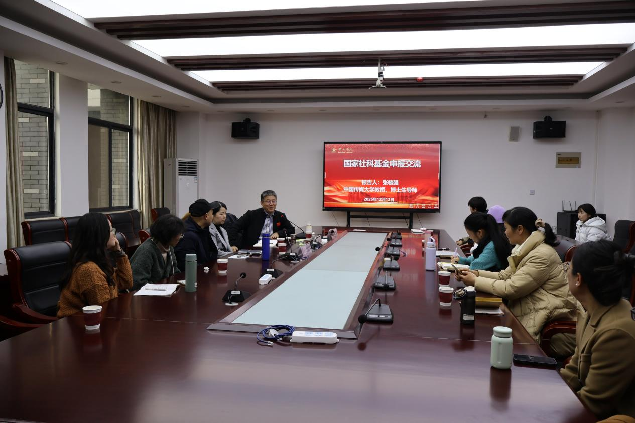 12月12日下午,文化与传播学院在320会议室举办国家社科基金申报交流专题讲座,特邀中国传媒大学教授,博士生导师张毓强作交流分享,黄山学院副院长姜红参加座谈会,文化与传播学院院长吕正兵主持讲座,文化与传播学院、外国语学院部分科研骨干教师参与此次交流。